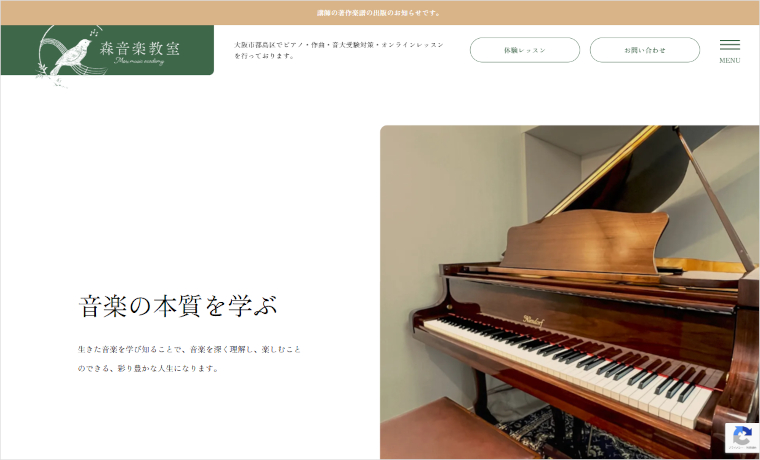 This is the website for Mori Music School in Miyakojima Ward, Osaka City. Using the TCD theme “Cherie”, they carefully convey the school’s appeal and their passion for lessons.