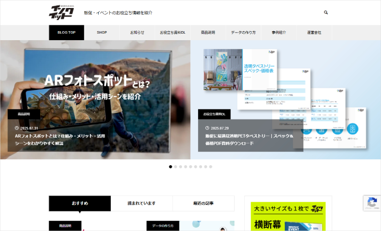 Our company operates the e-commerce site “Inkit” for sales promotion and event-related printed materials and display fixtures. To strengthen sales promotion and information dissemination, we launched a blog using the WordPress theme “Muum”.