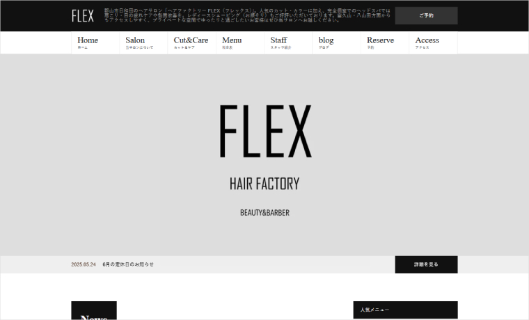 This is the website for HAIR FACTORY FLEX, a fully private-room hair salon in Koriyama City, Fukushima Prefecture. They utilize the Beauty theme, known for its stylish and functional design.