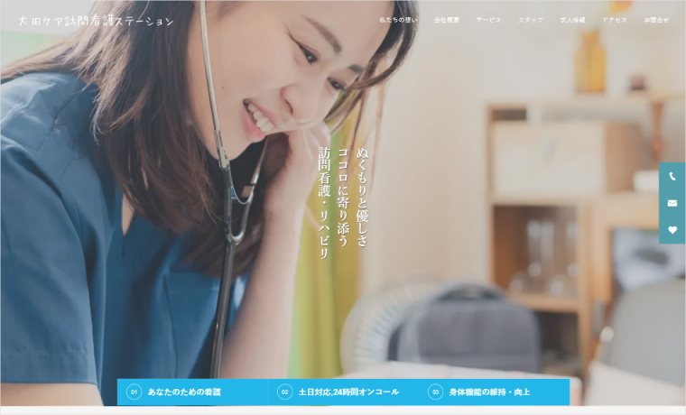 The three-point box placed below the header content concisely conveys the information users seek, effectively highlighting the facility’s appeal and service strengths. In the home-visit nursing industry, conveying trust and reassurance is crucial, making this visually clear feature highly effective.