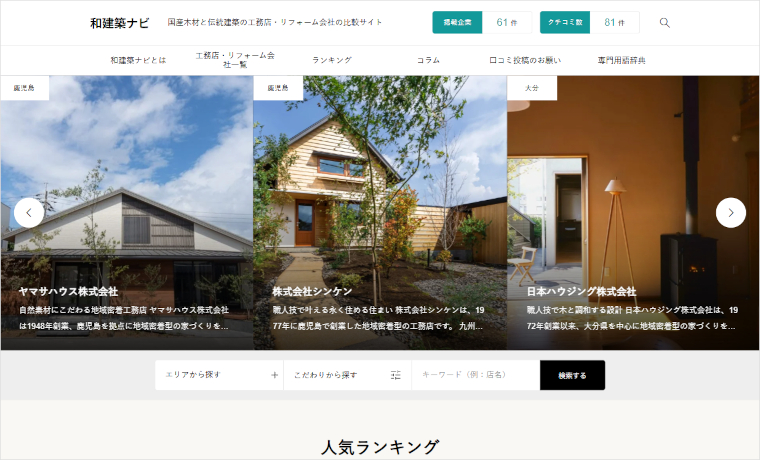 This site compares and introduces construction companies, design offices, and renovation firms specializing in domestic timber and traditional Japanese building techniques.