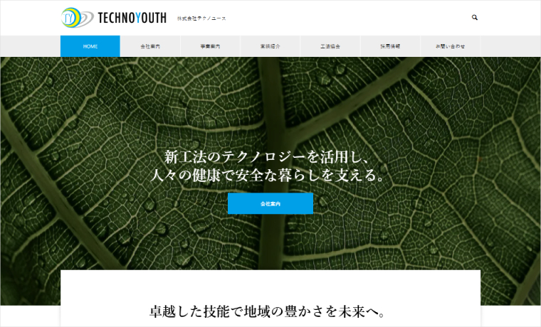 This is the website for Techno Youth Inc., a company based in Fukuoka that undertakes civil engineering projects and pipe rehabilitation work. They are utilizing the NANO theme for corporate website construction.