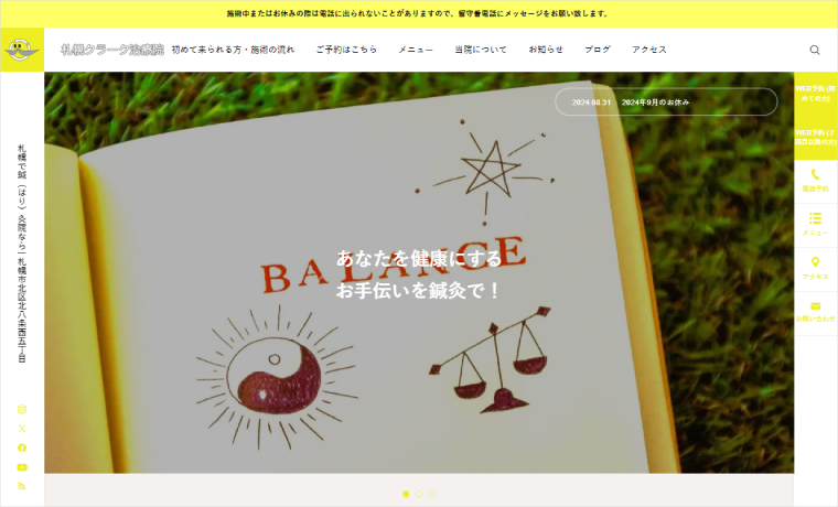 This is the website for Sapporo Clark Clinic, an acupuncture and moxibustion clinic located in Kita-Hachijo, Kita Ward, Sapporo. They are using SERUM.